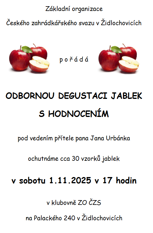 Pod vedením přítele pana Jana Urbánka ochutnáme v sobotu 1. 11. 2025 v klubovně ZO ČZS, Palackého 240 v Židlochovicích asi 30 vzorků jablek. Jste srdečně zváni.